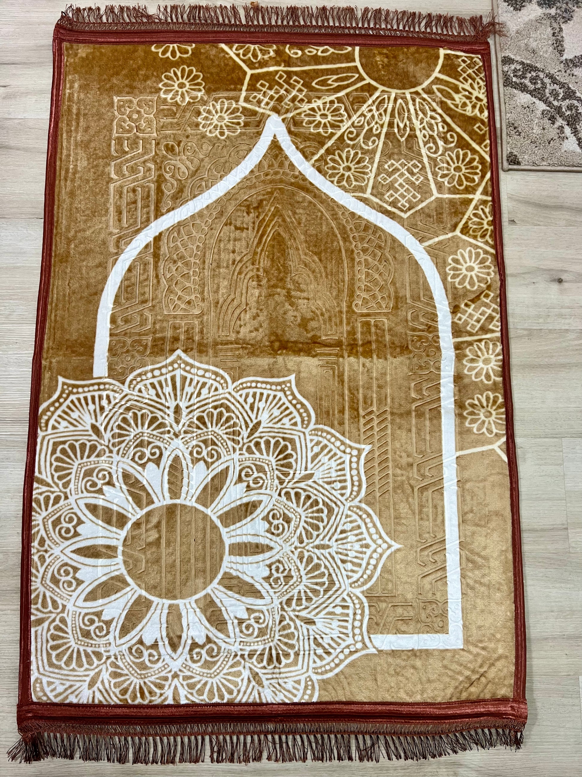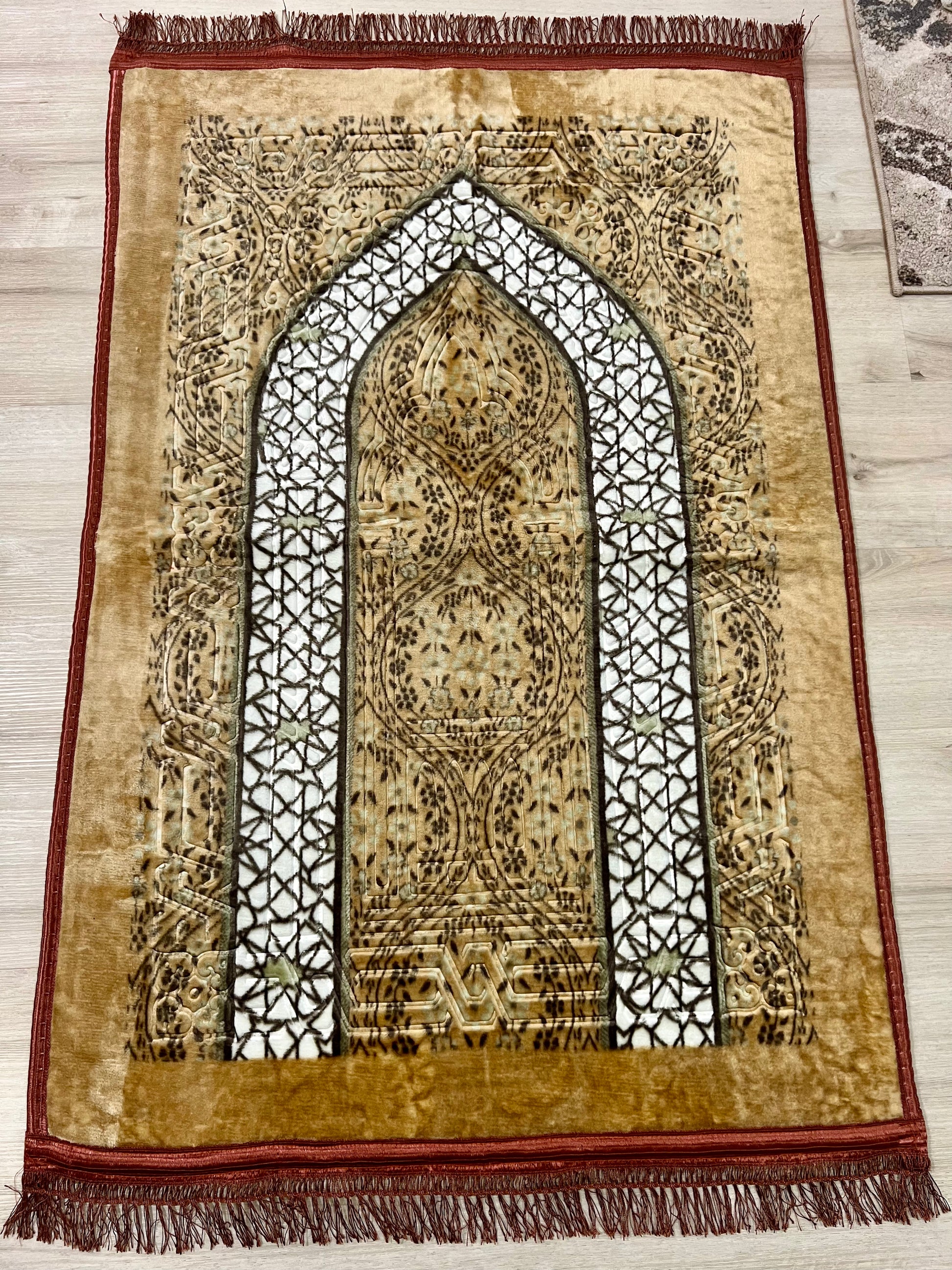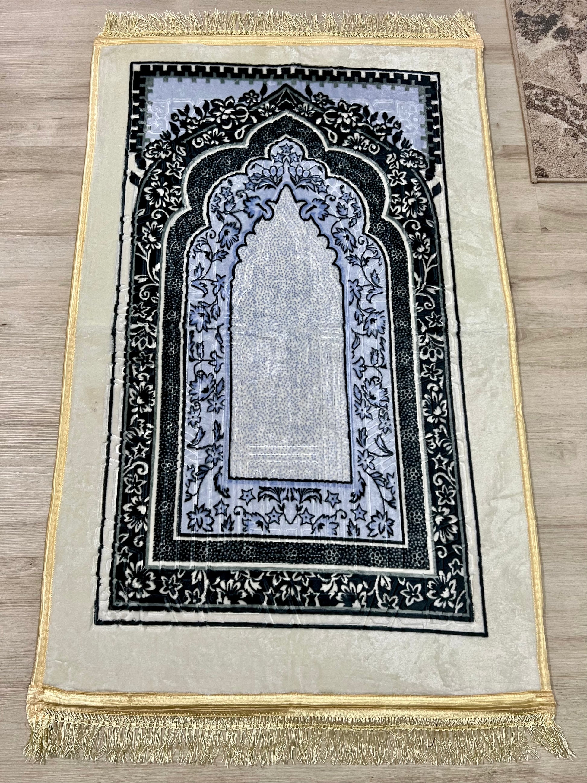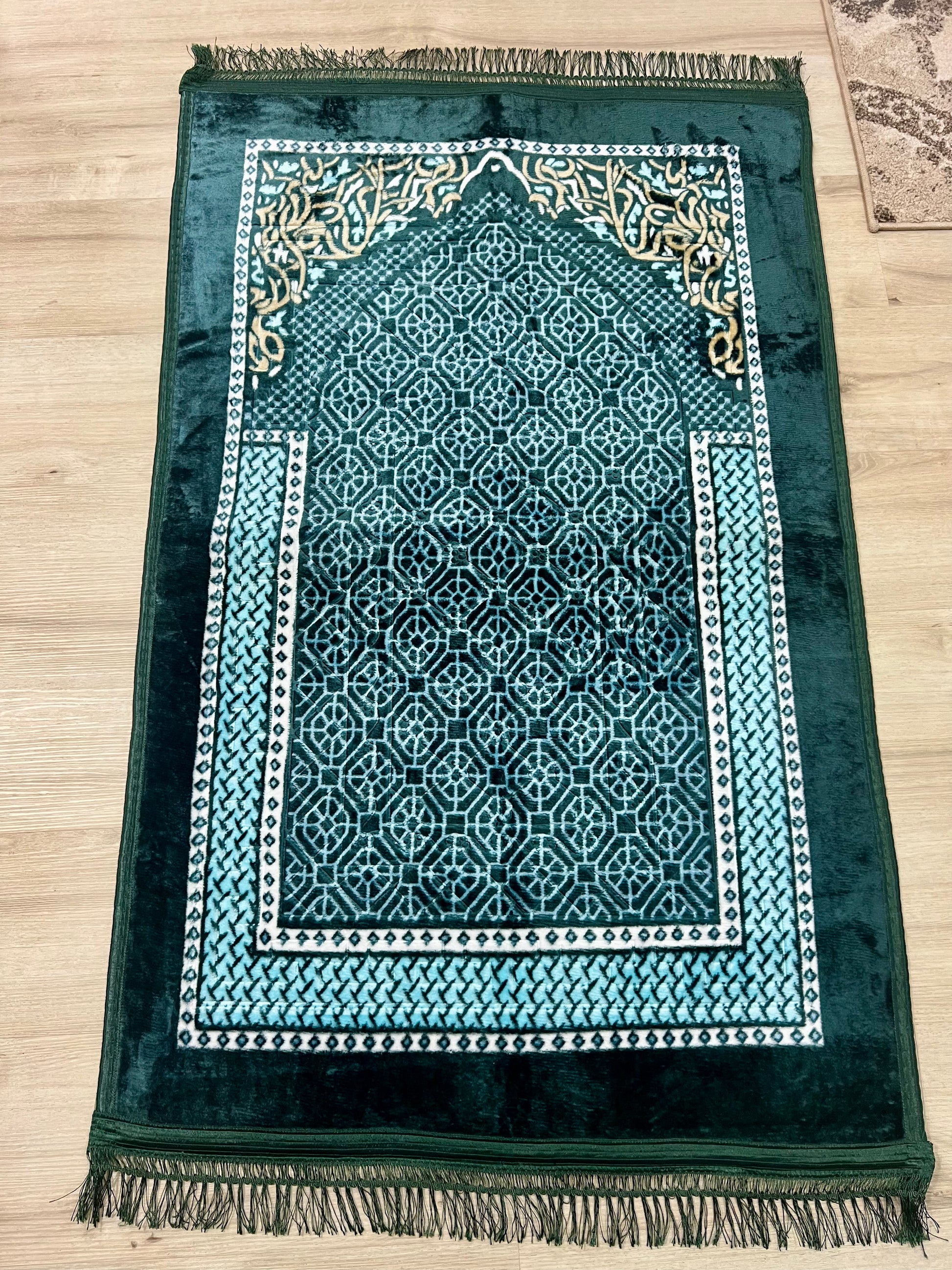 Sized at 80 × 120 cm, it offers ample space for comfortable prayer without taking up too much room. The intricate Turkish-inspired patterns add a timeless, elegant touch, reflecting the rich heritage of Islamic craftsmanship.