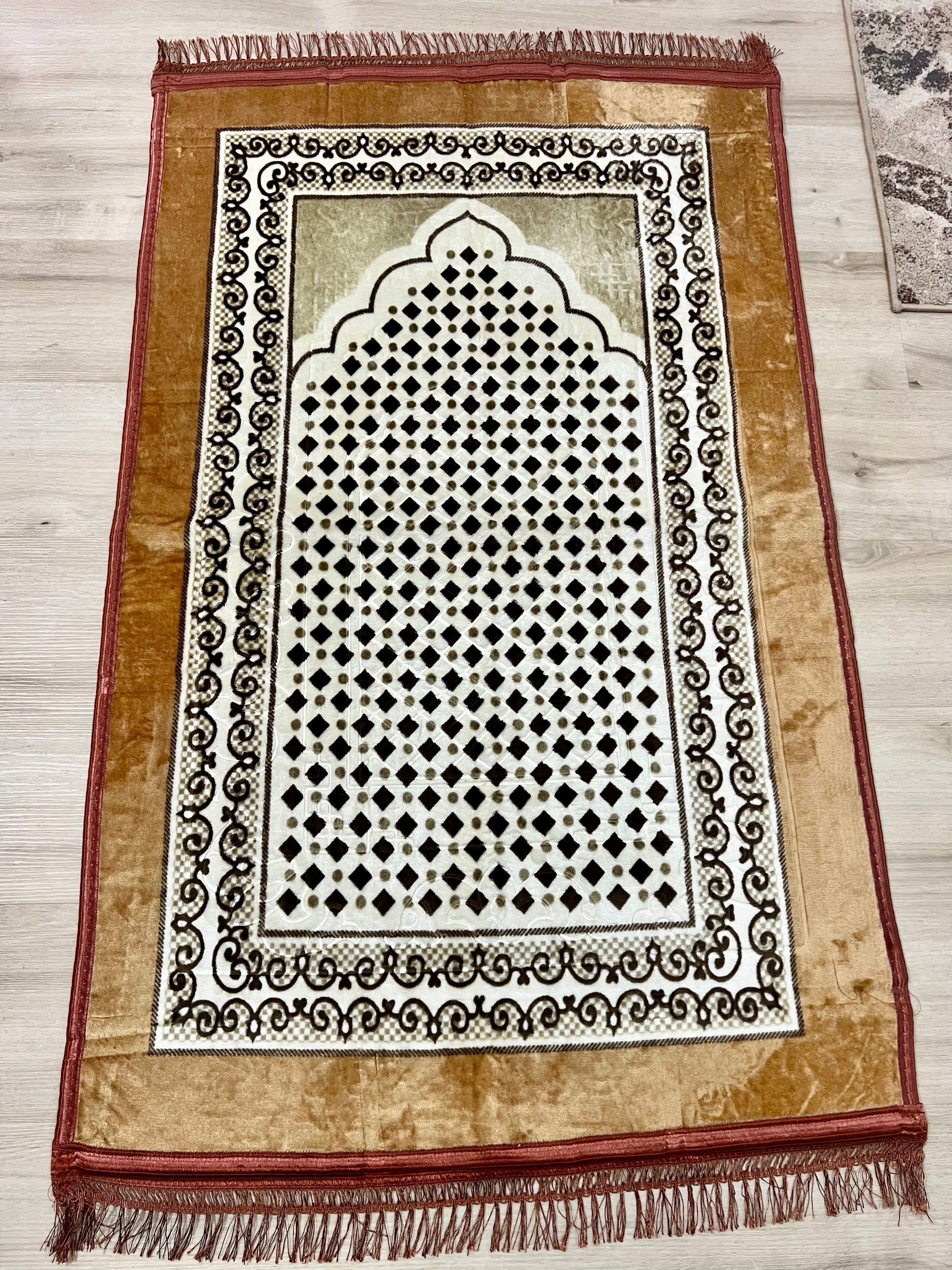 Bring comfort and tradition to your daily salah with this beautifully crafted Turkish prayer rug. Made from durable polyester, this rug is lightweight, soft to the touch, and easy to maintain—perfect for everyday use at home or while traveling.